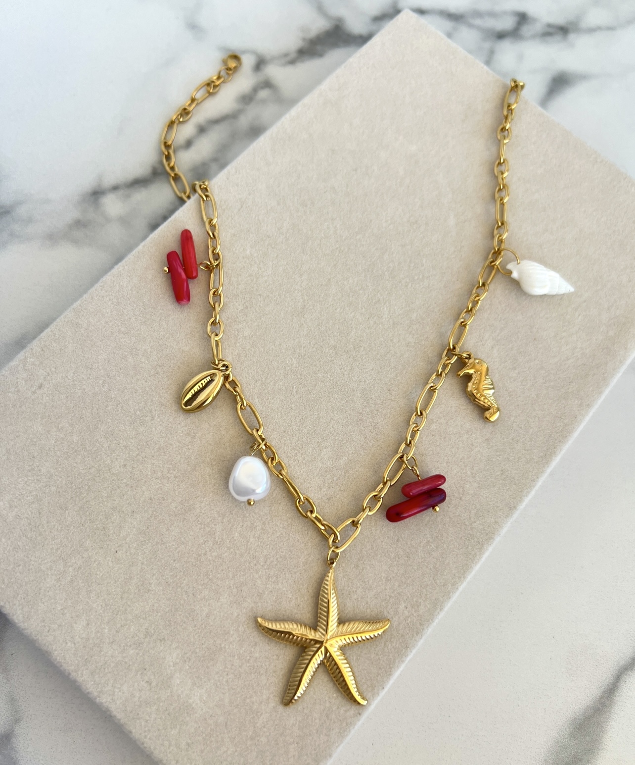 - Υλικό: Επιχρυσωμένη ατσάλινη αλυσίδα, επιχρυσωμένα ατσάλινα στοιχεία, κοχύλι