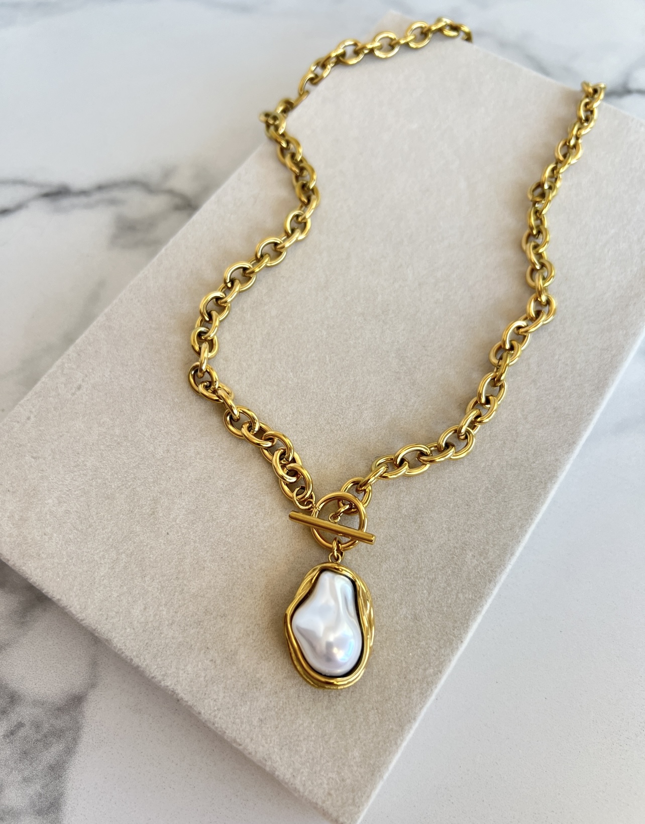 - Υλικό: Επιχρυσωμένη ατσάλινη αλυσίδα, ατσάλινο στοιχείο με πέρλα