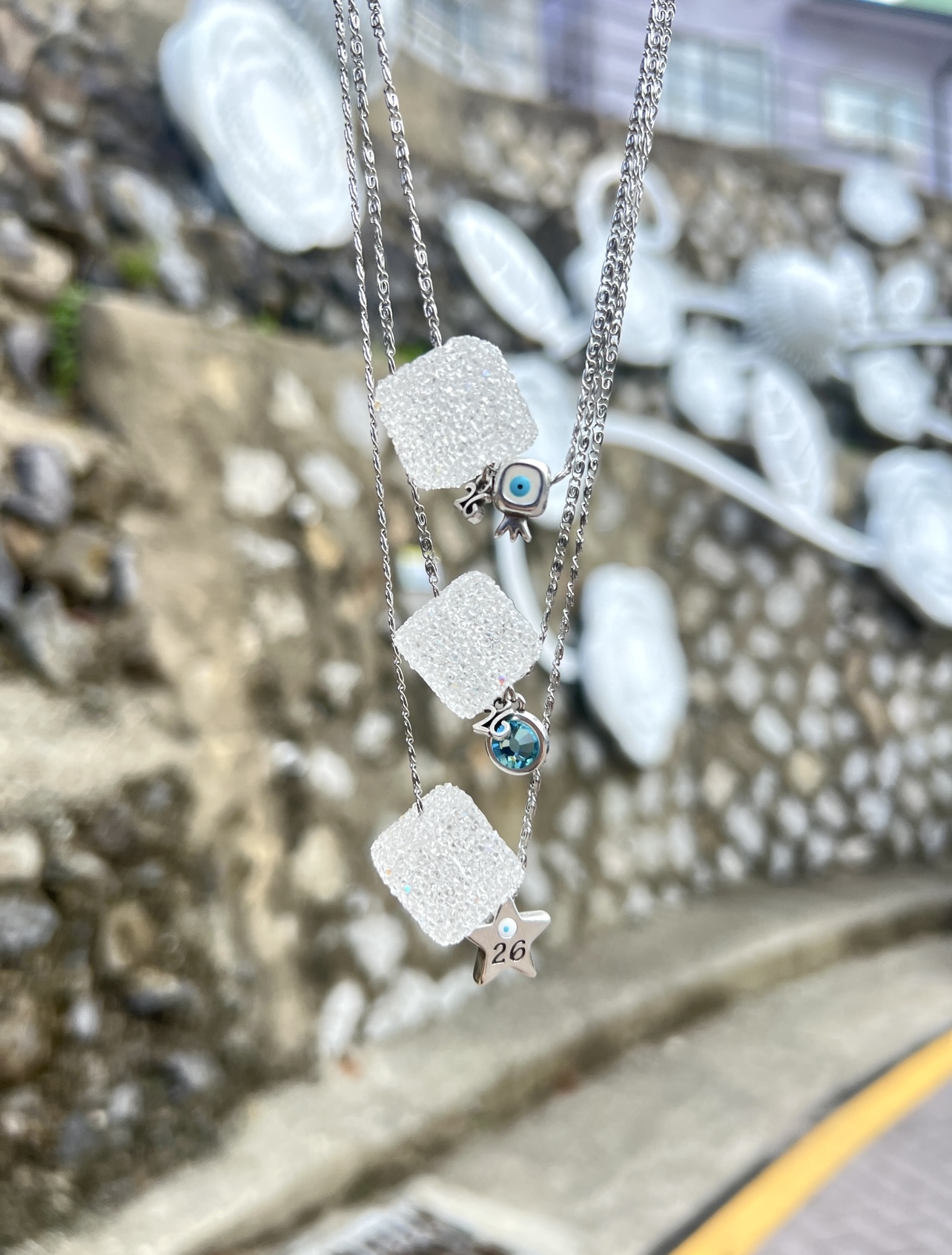 Υλικά: Ατσάλινη Αλυσίδα, επαργυρωμένα στοιχεία, κύβος από κρυσταλλάκια