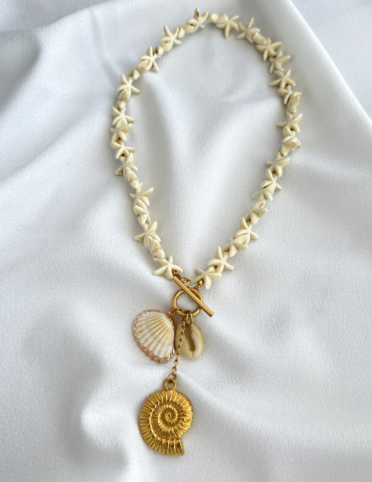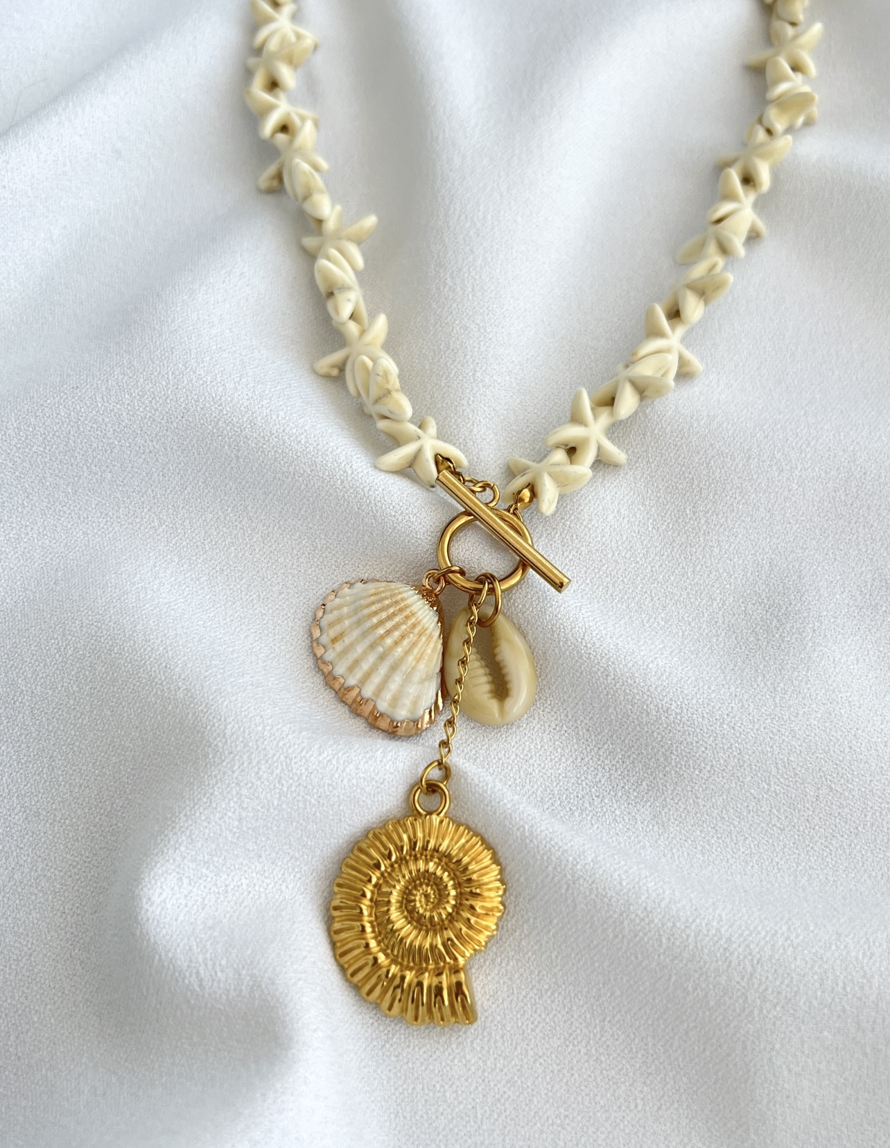 - Υλικό: Επιχρυσωμένη ατσάλινη αλυσίδα, επιχρυσωμένα ατσάλινα στοιχεία, κοχύλια, χάντρες χαολίτη