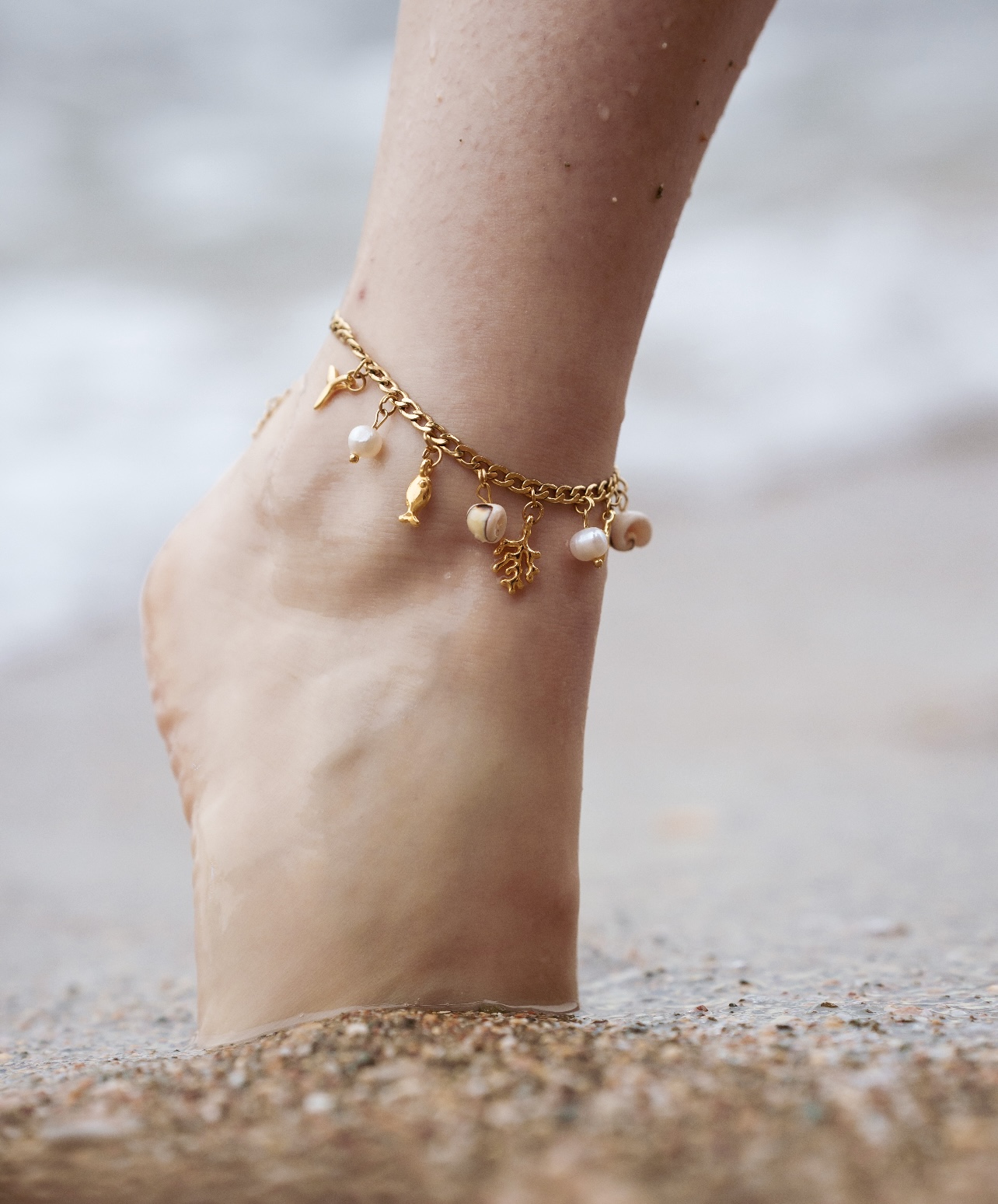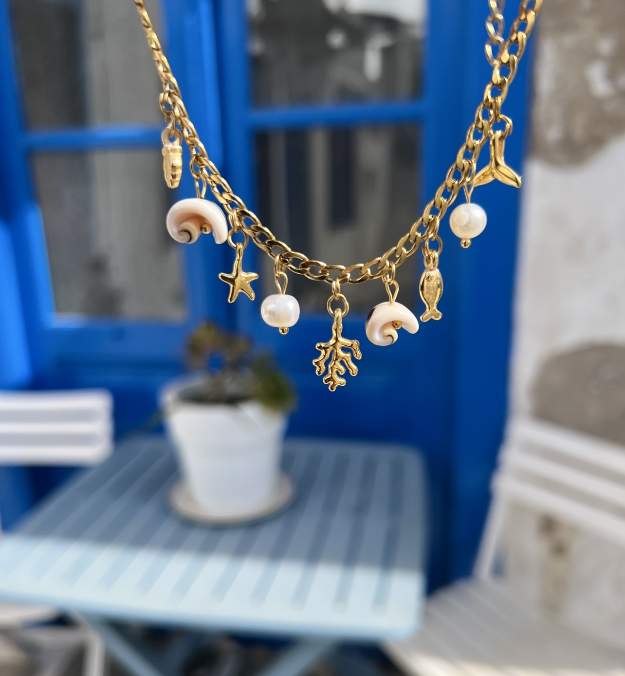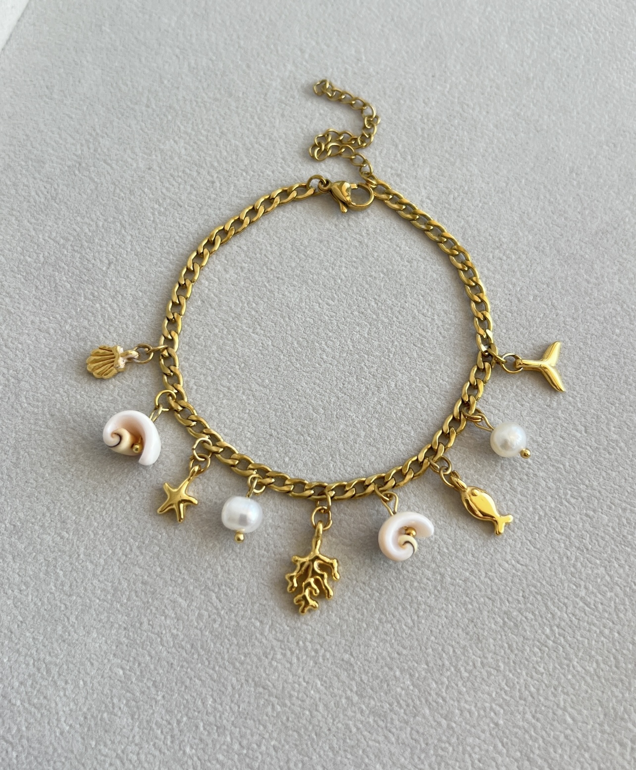 •Υλικά: Αλυσίδα από επιχρυσωμένο ατσάλι, κοχύλια, μαργαριτάρια